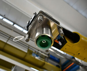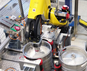 Eigenständiges Kegkappen-Aufsetzer mit Industrieroboter, geeignet für das Aufbringen von Clip-on-Kappen auf Kegs. Der Roboter leistet bis zu 1.400 Fässer pro Stunde und passt dabei Kraft und Höhe des Verschlusses an. Damit ist es die ideale Lösung für Hochgeschwindigkeits-Kegabfüllanlagen.